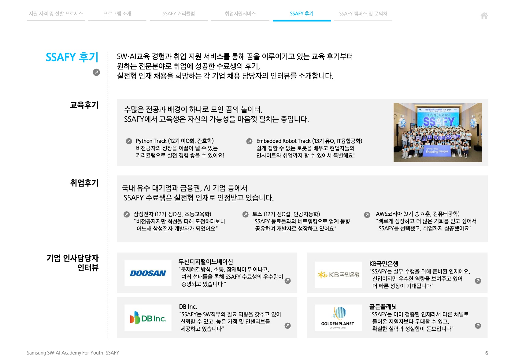 2. 장소 : 광운대학교 새빛관 102호 계단 강의실 3. 강연자 : 삼성전자 강대범 파트장 (2010년 컴퓨터공학과 석사 졸업) 4. 강연 주제 : 컴공 졸업생에게 듣는 컴퓨터공학 전공자 진로 및 취업 설명회 삼성전자 SSAFY 모집 설명회 5. 강연 대상 : 컴퓨터 공학 및 SW 전공 학부 3,4학년 및 대학원생(1,2학년도 참여가능), SW/AI 관련 분야 전공자(졸업자 및 졸업 예정자) 6. 기타 : SSAFY 15기 모집 관련 안내자료 첨부
