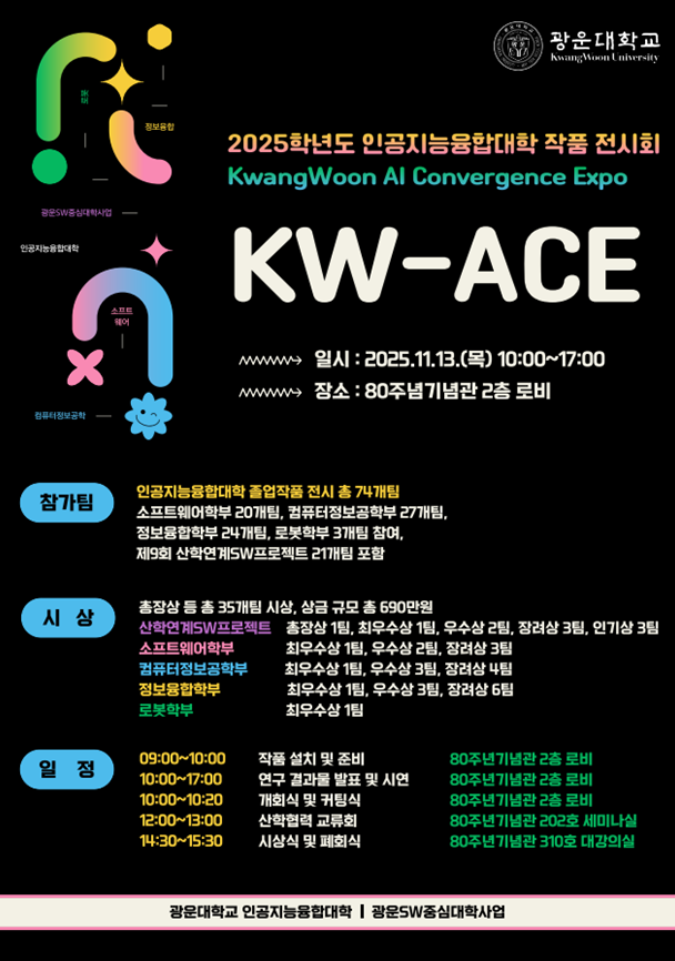「2025학년도 인공지능융합대학 작품 전시회 KW-ACE (KwangWoon AI Convergence Expo)」를 다음과 같이 개최하오니 많은 관심과 참여를 부탁드립니다.