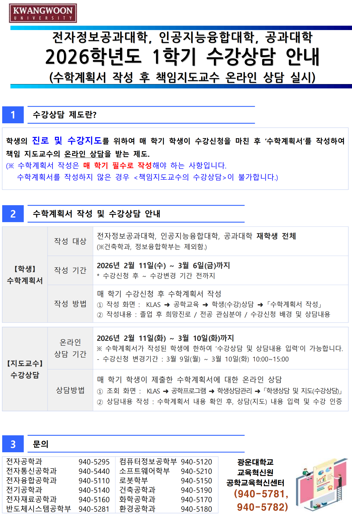 2026학년도 1학기 수강상담(수학계획서 작성 및 온라인 수강상담) 시행 안내