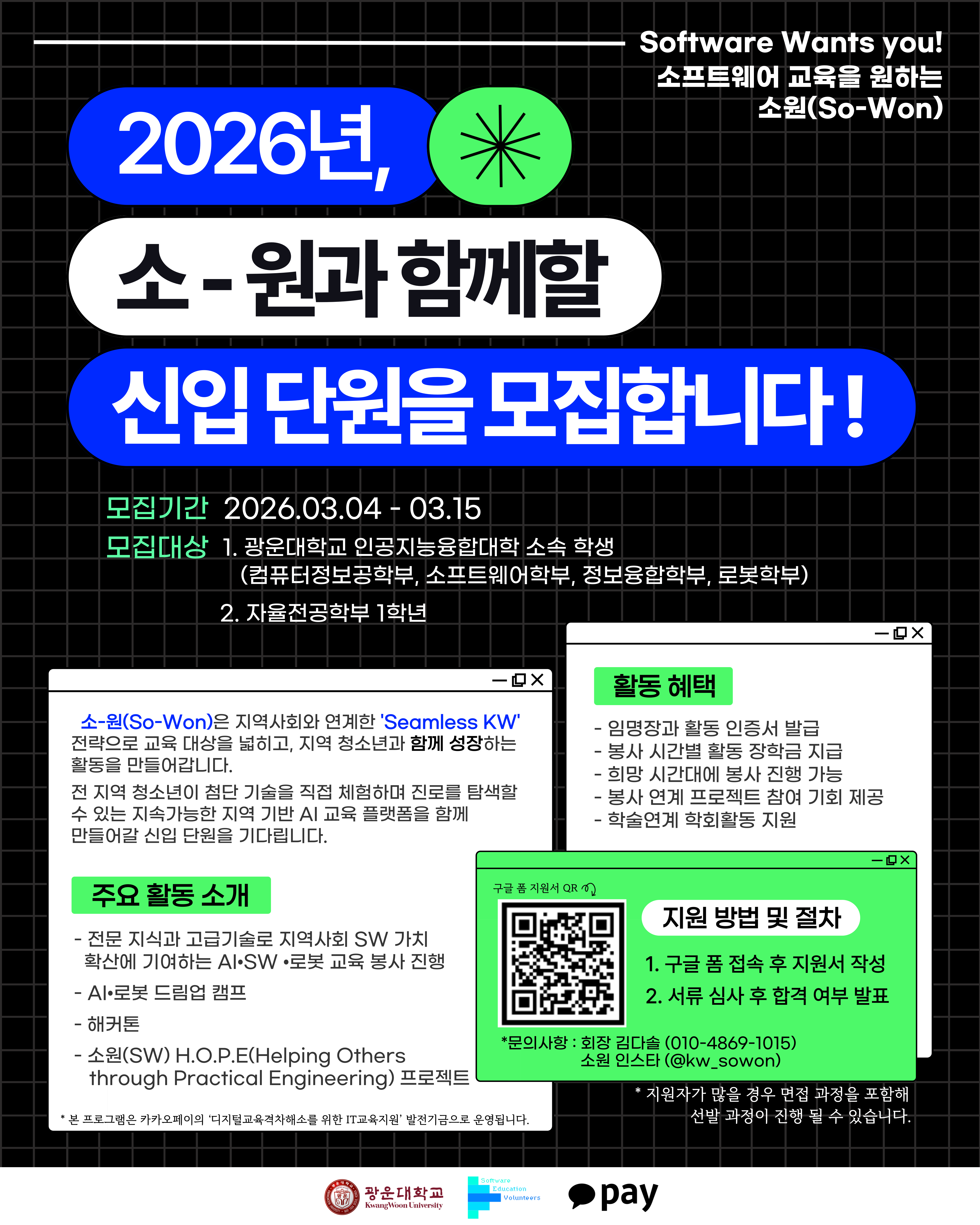 1. 모집 대상 : 광운대 인공지능융합대학 소속 학생 및 자율전공학부 1학년 2. 모집 기간 : 2026년 3월 4일(수) ~ 3월 15일(일) 까지 3. 지원 방법 : 구글 폼 ☞ 접속 후 지원서 작성 4. 모집 절차 : 서류 심사 후 합격 여부 발표 (면접은 필요 시 진행) 5. 봉사 대상 : 초·중·고 SW동아리 및 지역사회 취약계층 지원 6. 활동 내용 : - 전문 지식과 고급 기술로 지역사회 SW가치확산에 기여하는 AI·SW·로봇 교육 봉사 진행 - AI·로봇 드림업 캠프 - 해커톤 - 소원(SW) H.O.P.E(Helping Others through Practical Engineering) 프로젝트 7. 활동 혜택 : - 인공지능융합대학장 명의의 임명장 활동인증서 발급 - 봉사 장학금 지급 - 봉사 연계 프로젝트 참여 기회 제공 - 학술연계 학회 활동 지원 *본 프로그램은 카카오페이의 ‘디지털교육격차해소를 위한 IT교육지원’ 발전기금으로 운영됩니다.