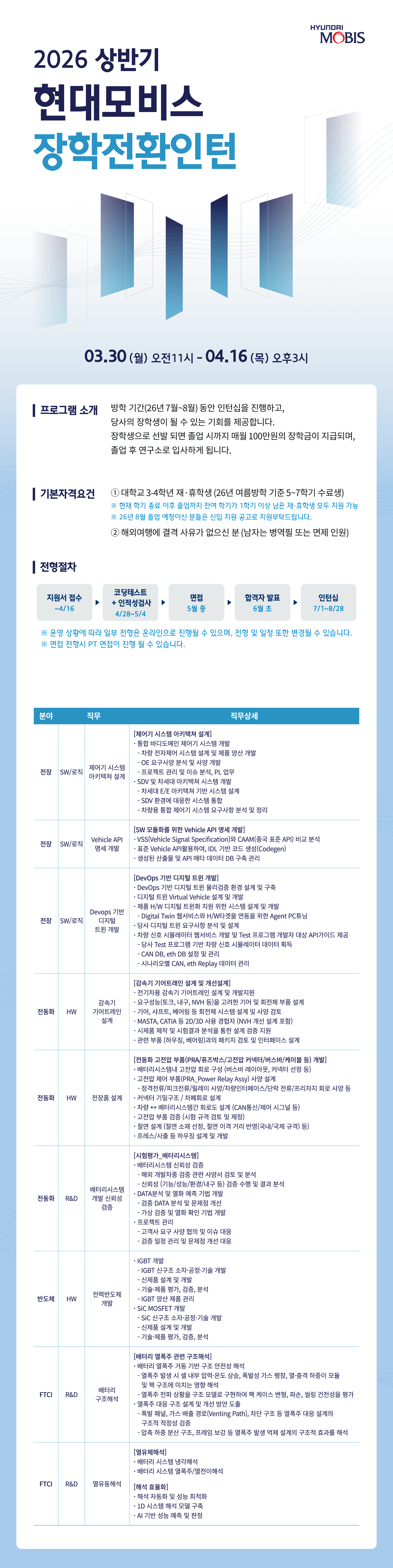 현대모비스에서 26년 상반기 장학전환인턴을 선발하고 있습니다. 현대모비스와 함께 모빌리티의 미래를 두 손으로 직접 열어갈 여러분의 많은 관심과 지원 바랍니다. ■ 프로그램 소개 방학 기간 (26년 7월~8월) 동안 인턴십을 진행하고, 당사의 장학생이 될 수 있는 기회를 제공합니다. 장학생으로 선발 되면 졸업 시까지 매월 100만원의 장학금이 지급되며, 졸업 후 연구소로 입사하게 됩니다. ■ 기본 자격 요건 ① 대학교 3-4학년 재·휴학생 (26년 여름방학 기준 5~7학기 수료생) ※ 현재 학기 종료 이후 졸업까지 잔여 학기가 1학기 이상 남은 재·휴학생 모두 지원 가능 ※ 26년 8월 졸업 예정이신 분들은 신입 지원 공고로 지원부탁드립니다. ② 해외여행에 결격 사유가 없으신 분 (남자는 병역필 또는 면제 인원) ■ 모집일정 3월 30일(월) ~ 4월 16일(목) 오후 3시 |